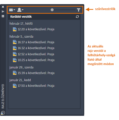 A Rajz előzményei paletta megjeleníti a OneDrive, Dropbox és Box szolgáltatásokba mentett rajzok verzióit. Minden alkalommal, amikor ment egy felhőtárhely-szolgáltatói fiókban tárolt rajzot, a rendszer létrehozza a korábbi verziót, és megőrzi arra az esetre, ha össze szeretné hasonlítani a rajz aktuális verziójával. Ezek a korábbi verziók alkotják a rajz verziótörténetét.