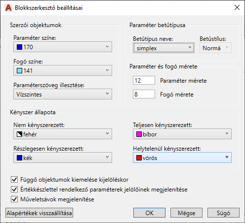 Paraméter és fogó objektumok színét szabályozza, továbbá megadja a paraméterszöveg tájolását.
