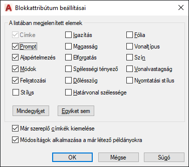 Meghatározza az attribútumlistában megjelenítendő tulajdonságokat. Csak a kijelölt tulajdonságok jelennek meg a listában. A Címke tulajdonság mindig ki van jelölve.