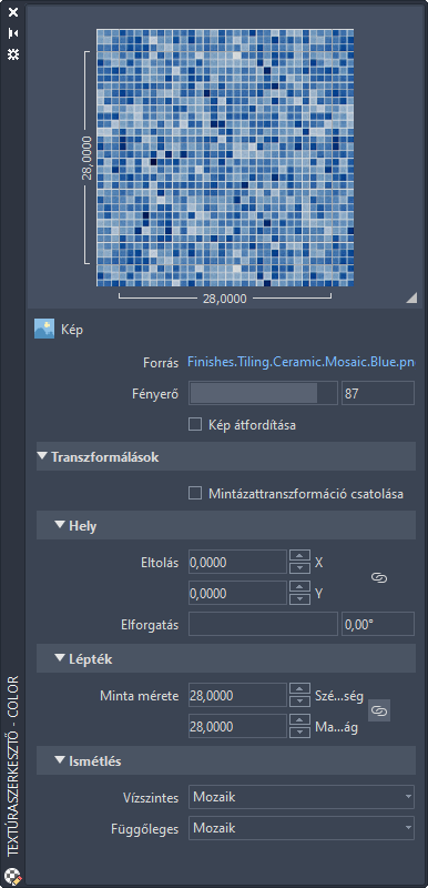 Kép vagy procedurális alapú textúrák tulajdonságait szerkeszti.