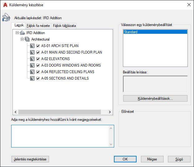 Jelentésinformációt jelenít meg, amely belekerül a küldeménycsomagba. Magában foglal minden beírt küldemény-megjegyzést, és tartalmazza azokat a program által automatikusan létrehozott disztribúciós megjegyzéseket, amelyek részletezik, hogy milyen lépések szükségesek a küldeménycsomag tökéletes működéséhez. Ha például SHX betűtípusok találhatók egy küldött rajzban, megjelenik egy útmutató arról, hova kell másolnia ezeket a fájlokat ahhoz, hogy azok a küldeményt telepítő számítógépen észlelhetők legyenek. Ha készült alapértelmezett megjegyzéseket tartalmazó szövegfájl, akkor a jelentés ezeket is tartalmazza.
