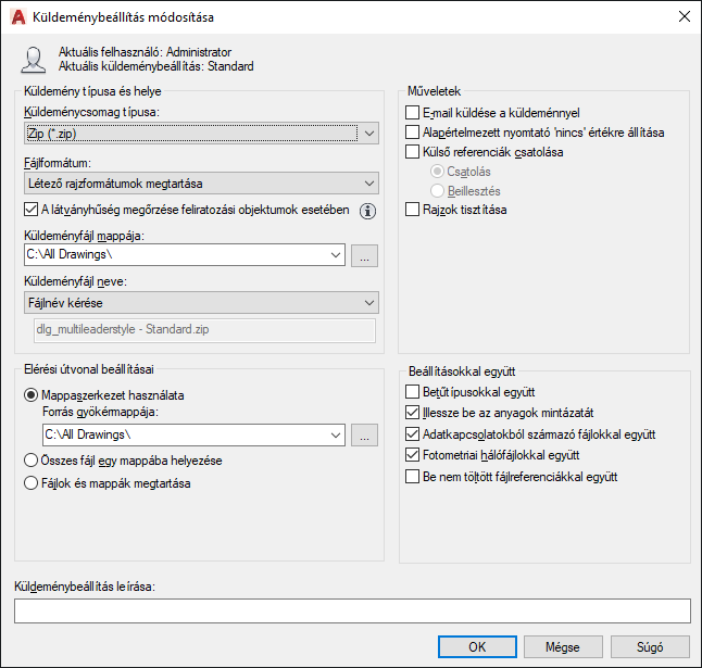 Ha nem módosítja ezt a mezőt, akkor a küldeményfájl az elsőnek megadott rajzfájlt tartalmazó mappában került létrehozásra. Lapkészlet-környezetben a küldeményfájl a lapkészletadat (DST) -fájlt tartalmazó mappában kerül létrehozásra. (Az AutoCAD LT programban nem alkalmazható.)