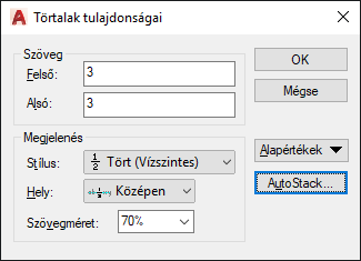 Megjeleníti az AutoStack beállításai párbeszédpanelt. Az AutoStack csak akkor alakítja át a numerikus karaktereket törtalakúvá, ha azok közvetlenül a kalap, a perjel vagy a kettős kereszt karakterek előtt vagy után szerepelnek.
