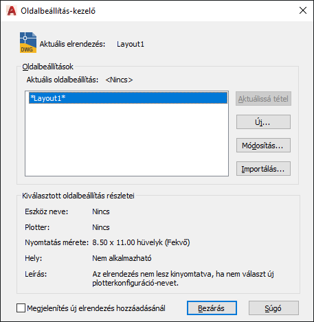 Létrehozhat továbbá elnevezett oldalbeállításokat, módosíthat meglévőket, vagy importálhatja más rajzok oldalbeállításait.