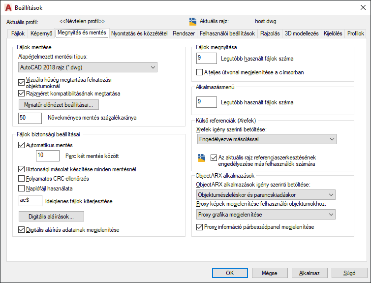 perc két mentés között: Amikor az Automatikus mentés be van kapcsolva, megadja, milyen gyakran kerül mentésre a rajz. (SAVETIME rendszerváltozó)