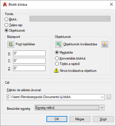 A kiválasztott objektumok mentése egy megadott rajzfájlba, vagy blokk konvertálása rajzfájllá.