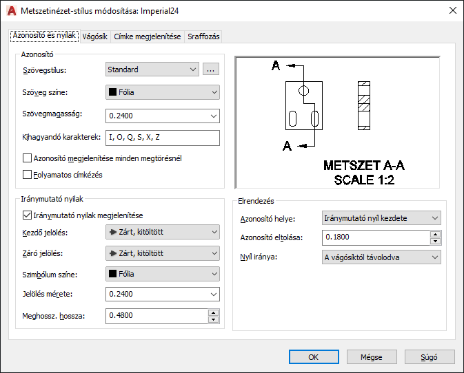 Azonosító és nyilak lap (Metszetinézetstílus-kezelő)