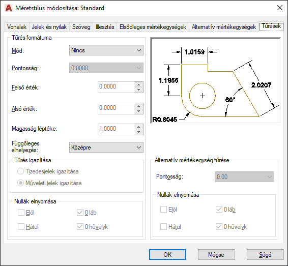 A méretszöveg-tűrések megjelenítését és formátumát adja meg.