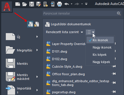 Megjegyzés: Az alkalmazásmenü Legutóbbi dokumentumok és a Megnyitott dokumentumok listájában egyaránt a kiválasztott megjelenítési beállítás lesz érvényben.