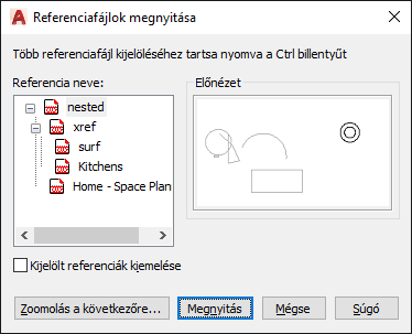 A Referenciafájlok megnyitása párbeszédpanel egy referenciafában az összes egymásba ágyazott xrefet megjeleníti. A kijelölt xref forrásfájlja egy külön rajzablakban nyílik meg, ahol szerkeszthető, menthető, majd bezárható a rajz.