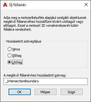 Alapértelmezés szerint az összes metszetblokk-geometria a 0-s (nullás) fóliára kerül. Azonban megadhat a metszetblokk komponenseinek rendszerezését segítő elő- vagy utótagot, például a metszet határvonalát és kitöltését. Amikor a metszetblokk beillesztésre kerül, a metszetblokk komponensei olyan új fóliára kerülnek, amelynek neve együttesen tartalmazza a metszet objektum fóliájának nevét és a megadott elő- vagy utótagot. Ha a metszősík két vagy több fólián elhelyezkedő objektumot tartalmaz, akkor két vagy több új objektumfólia keletkezik.