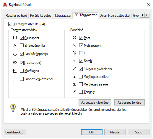 A 3D tárgyraszterek be- és kikapcsolása. A 3D tárgyraszter módok területen kiválasztott egyes tárgyraszterek aktívak, amíg a 3D tárgyraszter be van kapcsolva. (3DOSMODE rendszerváltozó)