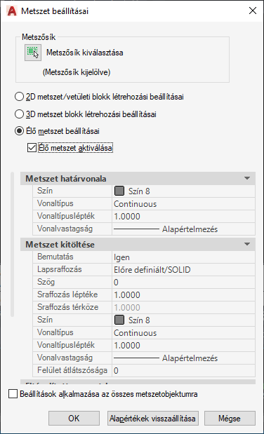 Metszet Beállítások párbeszédpanel