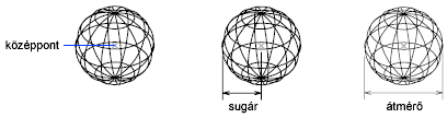 Gömb megadásához adja meg középpontját és sugarának egy pontját. Árnyékolt vagy takartvonalas látványstílusban a háromdimenziós, nem síklapokkal határolt szilárdtestek (például a gömb) finomsága a FACETRES rendszerváltozóval szabályozható.