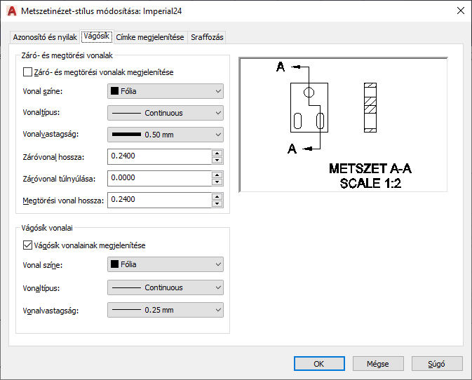 Beállítja a metszetvonalak által használt záró- és hajlítási vonalak, valamint a síkvonalszakaszok tulajdonságait.