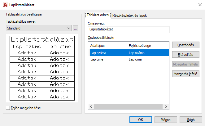 Lehetővé teszi a laplista táblázat oszlopfejeiben lévő címszöveg megváltoztatását.
