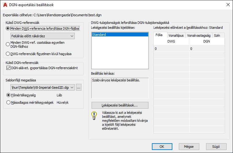 Az alapértelmezett leképezési beállítás a Standard, amely adatokat emel ki az éppen exportált rajzból, és a leképezési előnézetben látható módon automatikusan leképezi a DGN-fóliákat, a -vonalvastagságokat és a -színeket.