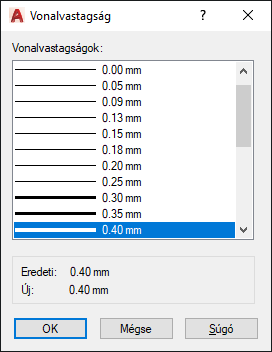 Az alkalmazható vonalvastagságok megjelenítése. A rendelkezésre álló vonalvastagságok olyan rögzített értékekből állnak, amelyek a leggyakrabban kerülnek alkalmazásra a rajzokban. Válasszon egy alkalmazni kívánt vonalvastagságot.