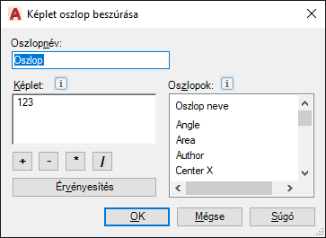 Megjeleníti a kiemelt rajzadatok és külső adatok (ha van adatkapcsolat) oszlopainak nevét. Ha duplán kattint az oszlop nevére, akkor az bekerül a Képlet mezőbe, de az oszlop nevét az Oszlop listáról is behúzhatja a Képlet mezőbe. A meglévő képlet oszlopok nincsenek felsorolva, és nem lehetnek más, újonnan készített képlet oszlopok értékei.