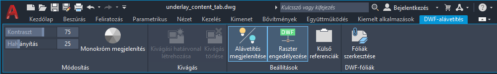 Amikor egy rajzban kiválaszt egy DWF-alávetítést, a szalagon megjelenik a DWF-alávetítés környezetfüggő lap.