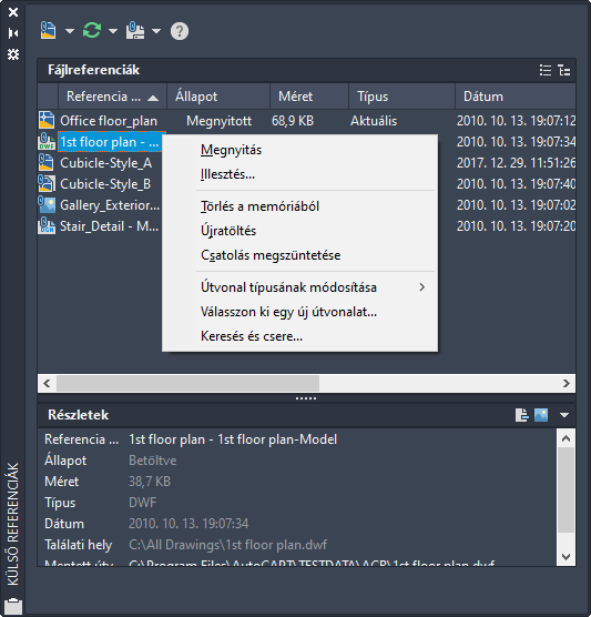 Ha a módosításra kijelölt referencia külső referenciákkal vagy blokkdefiníciókkal rendelkezik, a referencia és annak beágyazott referenciái a Referencia szerkesztése párbeszédpanelen választhatók ki. A beágyazott referenciák csak akkor jelennek meg, ha a kijelölésre kiválasztott objektum egy beágyazott referencia része. Egyszerre csak egy referencia választható ki módosításra. OLE-objektumokat tartalmazó referencia módosításakor az OLE-objektumok megjelennek, de szerkesztés céljából nem választhatók ki.