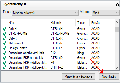2. A Gyorsbillentyűk ablaktáblán szűrje a nyomtatni kívánt gyorsbillentyűket típus és állapot szerint.