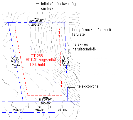 Minden teleknek van egy területfelirata, amely a telekre mint egészre utal. A telek kijelölését a telekfeliratra kattintva is elvégezheti. Egy telek szintén rendelkezhet szakaszfelirattal és társított táblázatokkal, amelyek a telekkel kapcsolatos információkat jelenítenek meg. A feliratok tartalmazhatnak a felhasználó által definiált tulajdonság mezőket.