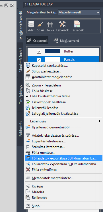Az exportáláshoz kattintson a jobb gombbal a Telkek fóliára.