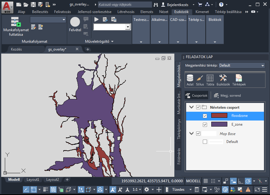 A fóliákat a program hozzáadta a térképhez, valamint az új Megjelenítéskezelő csoporthoz. A program felkéri, hogy adja meg a DWG-fájl nevét és elérési útvonalát. A .layer fájlokat a program a műveletben megadott helyre menti el.