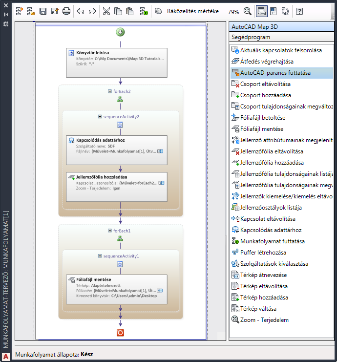 Ebben az esetben a program a ForEach műveletnek a „LoopAddLayers” nevet adta, hogy leírja annak működését. A művelet megvizsgálja a Könyvtár tartalmának megjelenítése műveletben megjelölt mappa összes SDF-fájlját. Minden ismétlődés esetén csatlakozik egy SDF-fájlhoz, és hozzáad egy jellemzőfóliát a Megjelenítéskezelőhöz.