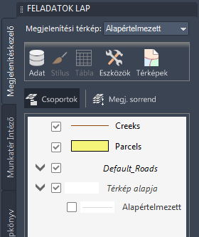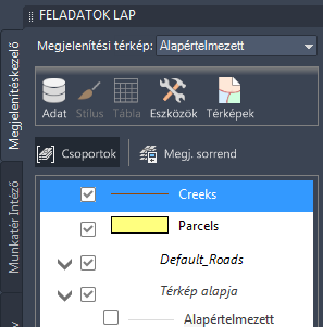A Megjelenítéskezelő lap az aktuális térkép fóliáit jeleníti meg.