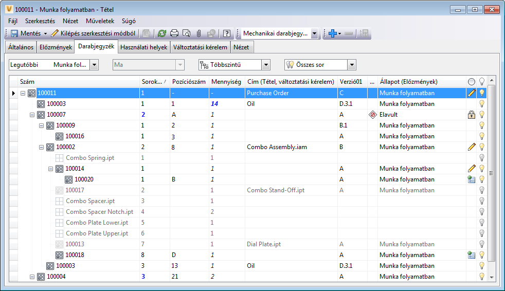 A DBJ hatékony kezeléséhez fontos a Darabjegyzék lap ikon- és állapotbeállításainak ismerete.