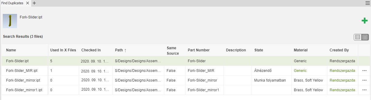 Az Inventor 2020.2 kiadásától kezdődően bevezettünk egy kettős ellenőrzési mechanizmust a többször előforduló alkatrészek ellenőrzésére. A legpontosabb eredmények érdekében frissítsen az Inventor 2020.2-es vagy újabb verziójára.