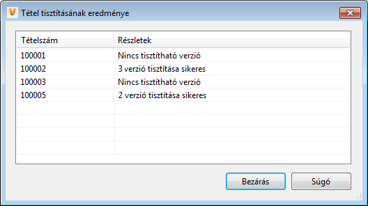 A Vault Client alkalmazással végzett Tételek tisztítása műveletet követően megjelenik a Tétel tisztításának eredménye párbeszédpanel. A párbeszédpanelben láthatók a tisztításra kiválasztott tételekhez tartozó tételszámok, valamint a verziók száma, melyet a program az egyes tételek esetén eltávolított.
