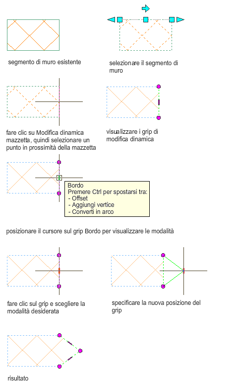 Nell'esempio seguente viene aggiunto un vertice al bordo di un componente muro mediante un grip Bordo.