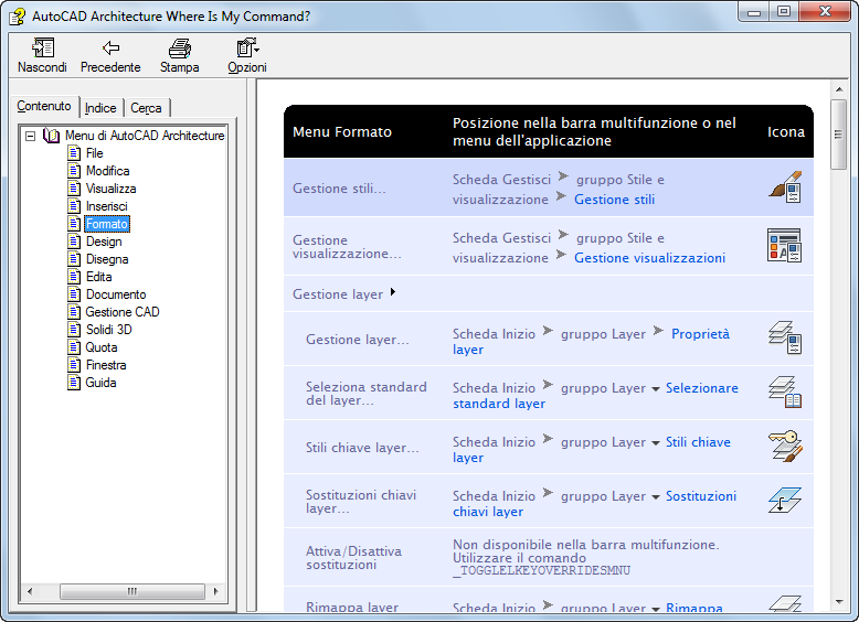 Lo strumento Guida alla ricerca dei comandi è una guida in cui sono indicate le posizioni precedenti di tutti i comandi nei menu e le posizioni correnti nella barra multifunzione.