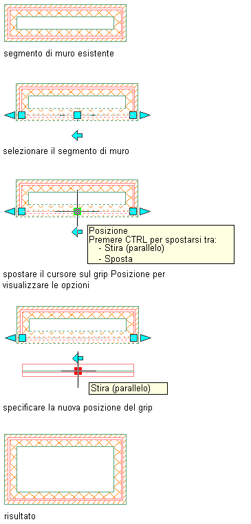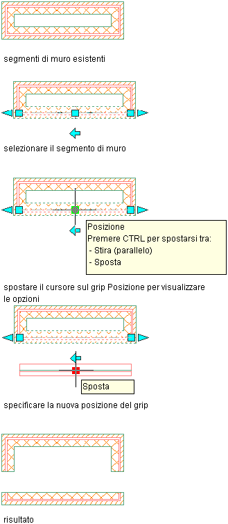 Nella seguente figura è illustrato come utilizzare il grip Posizione in modalità Stira (parallelo) per spostare un segmento di muro parallelo collegato e mantenere i collegamenti tra muri adiacenti.