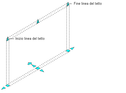Nella seguente figura sono illustrati i grip Inizio linea tetto e Fine linea tetto visualizzati per un segmento di muro diritto nelle viste 3D e 2D.