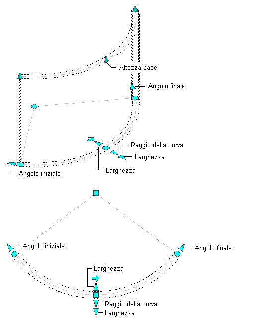 Nella seguente figura sono illustrati i grip Angolo iniziale, Angolo finale, Larghezza, Raggio della curva e Altezza base visualizzati per un segmento di muro curvo nelle viste 3D e 2D.