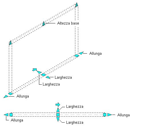 Nella seguente figura sono illustrati i grip Allungamento, Larghezza e Altezza base visualizzati per un segmento di muro diritto nelle viste 3D e 2D.