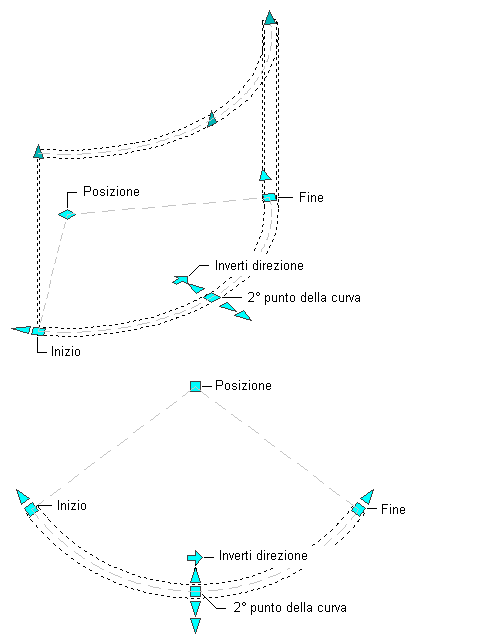 Nella seguente figura sono illustrati i grip Inizio, Fine, Inverti direzione, Secondo punto della curva e Posizione visualizzati per un segmento di muro curvo nelle viste 3D e 2D.