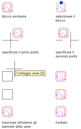 In alternativa, per una serie polare, specificare due punti per stabilire l'angolo della serie, immettere un valore per l'offset della distanza fra disegno al tratto o oggetto e premere INVIO.