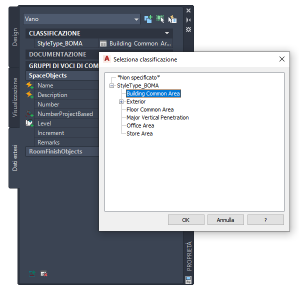 Ad esempio, se per il disegno è stato scelto lo standard di calcolo area BOMA, viene visualizzata la definizione della classificazione BOMA.