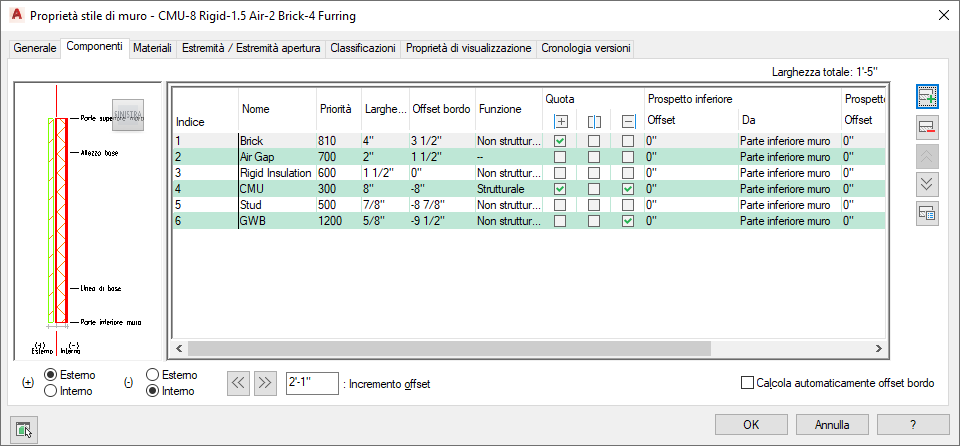 La scheda Componenti della finestra di dialogo Stili di muro consente di visualizzare tutti i componenti di muro mano a mano che vengono specificati.
