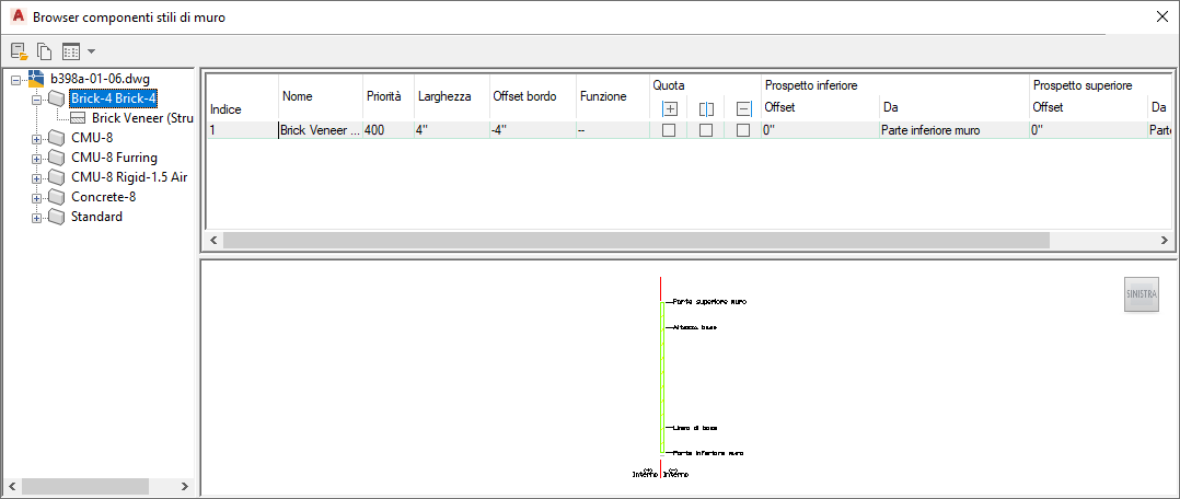 Il browser componenti stili di muro è un'utilità che consente di visualizzare e copiare dei componenti di muro da altri stili di muro nel disegno corrente e in altri disegni. È possibile copiare dei componenti da questi stili allo stile di muro corrente. Dopo averli aggiunti allo stile di muro, è possibile modificarne le proprietà secondo lo stile in corso di modifica.