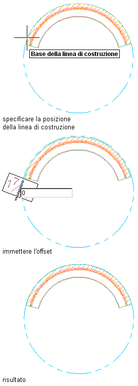 Disegno di una linea di costruzione con offset zero basata su un segmento di muro ad arco