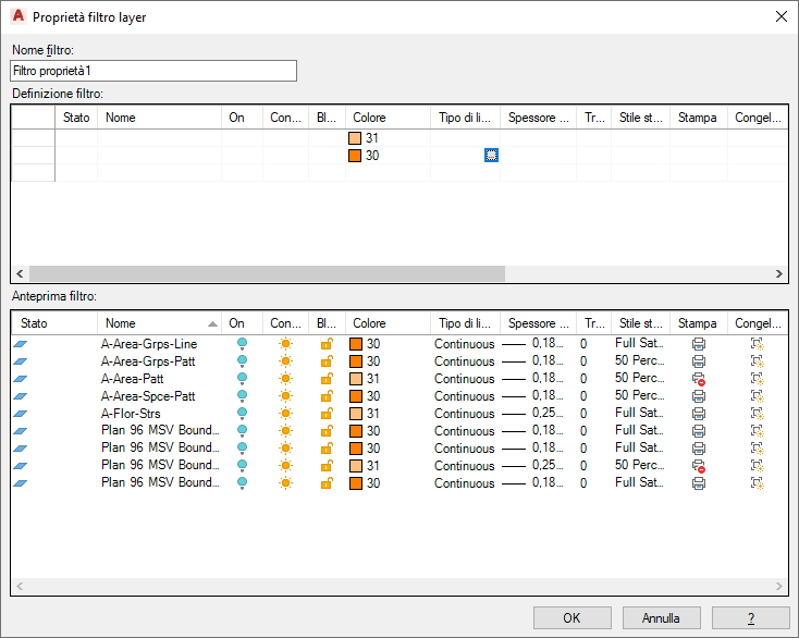 È inoltre possibile specificare più di un insieme di criteri per un filtro proprietà. Ad esempio, si può creare un filtro che include tutti i layer rossi congelati e tutti i layer blu congelati. Per determinare i layer da includere, si applica il criterio booleano AND/OR alle definizioni del filtro. Per essere incluso nel filtro, il layer deve soddisfare tutti i criteri di una singola riga. Nell'esempio in questione, per essere incluso nel filtro il layer deve essere congelato e rosso. Più righe offrono criteri alternativi. Nell'esempio seguente un layer deve essere sostituito con il colore 30 o con il colore 31.