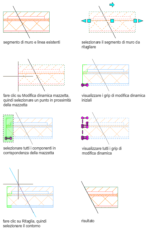 Per modificare una mazzetta mediante il ritaglio di un componente, attenersi alla procedura indicata di seguito. Un contorno di ritaglio può essere costituito da una linea, un arco, un cerchio, una polilinea o un bordo di componente muro.