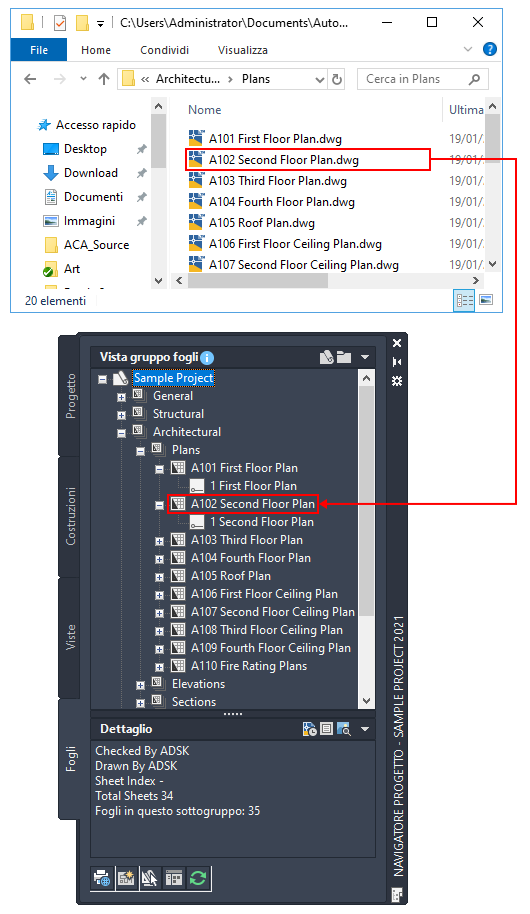- Trascinare la cartella sulla vista struttura dei disegni della scheda selezionata nel Navigatore progetto.
