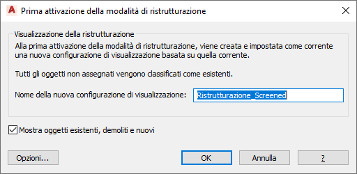 Viene visualizzata la finestra di dialogo Prima attivazione della modalità di ristrutturazione e alla nuova configurazione di visualizzazione viene assegnato per default un nome con il prefisso Ristrutturazione.